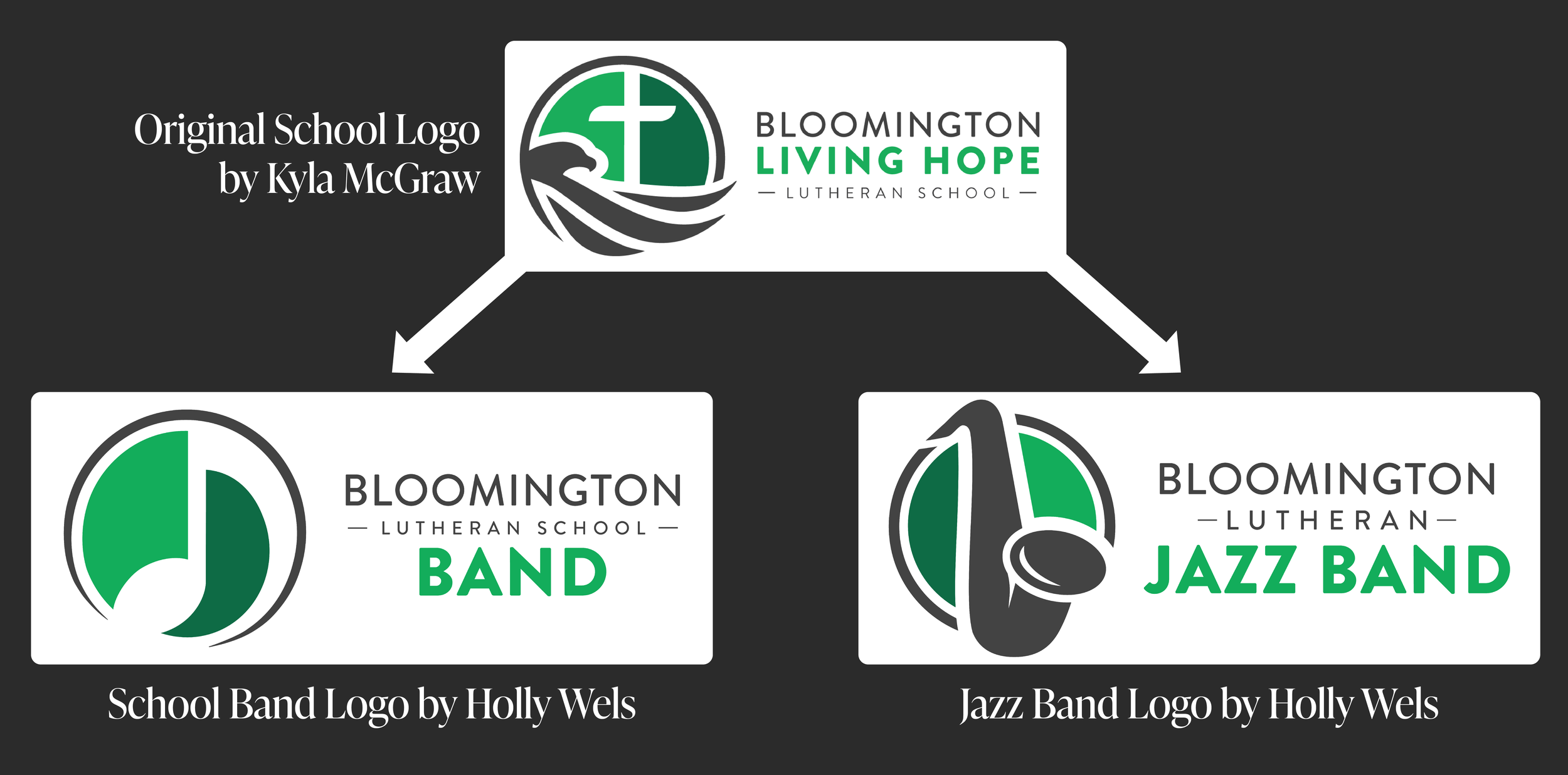 The Bloomington Lutheran School band director, Caleb Dobberstein, needed sub-brand logos for the grade school band and the jazz band that would work within the context of their recently refreshed school logo. He wanted something that would make his students proud to be a part of their band, and that would look good on promotional materials such as polos, newsletters, table cloths, percussion equipment, and other merch.